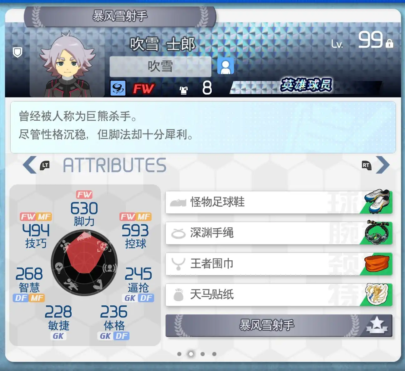 既然闪十一一直以来都被称作RPG类型的游戏,自然是有原因的,足球队里的成员们都有着自己的数据,你可以通过特训,练习赛,对战等方式来提升等级提高这些数据,他们会帮助你在足球的「直接对抗」(过人,抢断,射门,防守等方面)提供巨大的帮助。