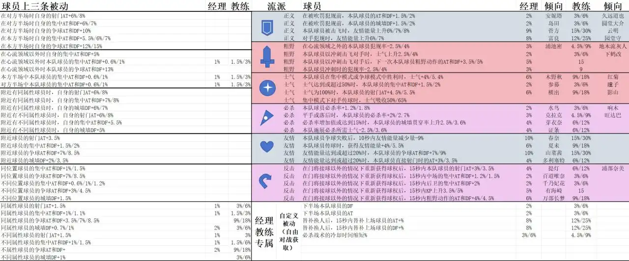 相同球员能够拥有不同的被动,上三条是通用型,不过在FW-MF-DF-GK上有不同的偏好,下二条则是与流派相关,他关系到你阵容的整体风格与战斗基调。