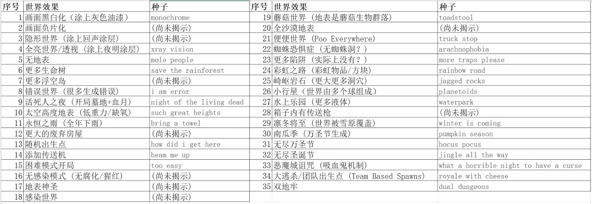 种子为hocus pocus,种子特性为世界永远处于万圣节中,npc会一直售卖对映物品,敌怪也会掉落礼袋。