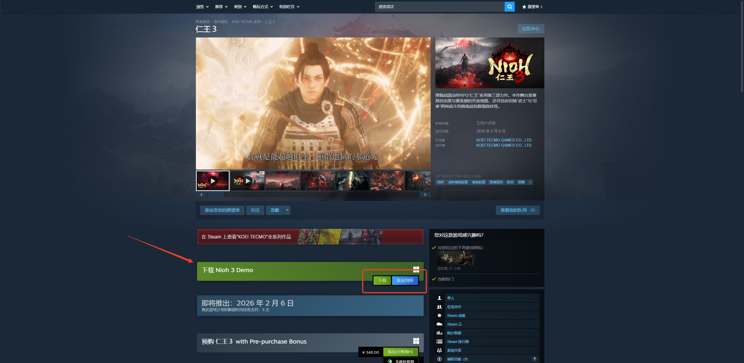 3.下滑找到Nioh 3 Demo,然后点击下载