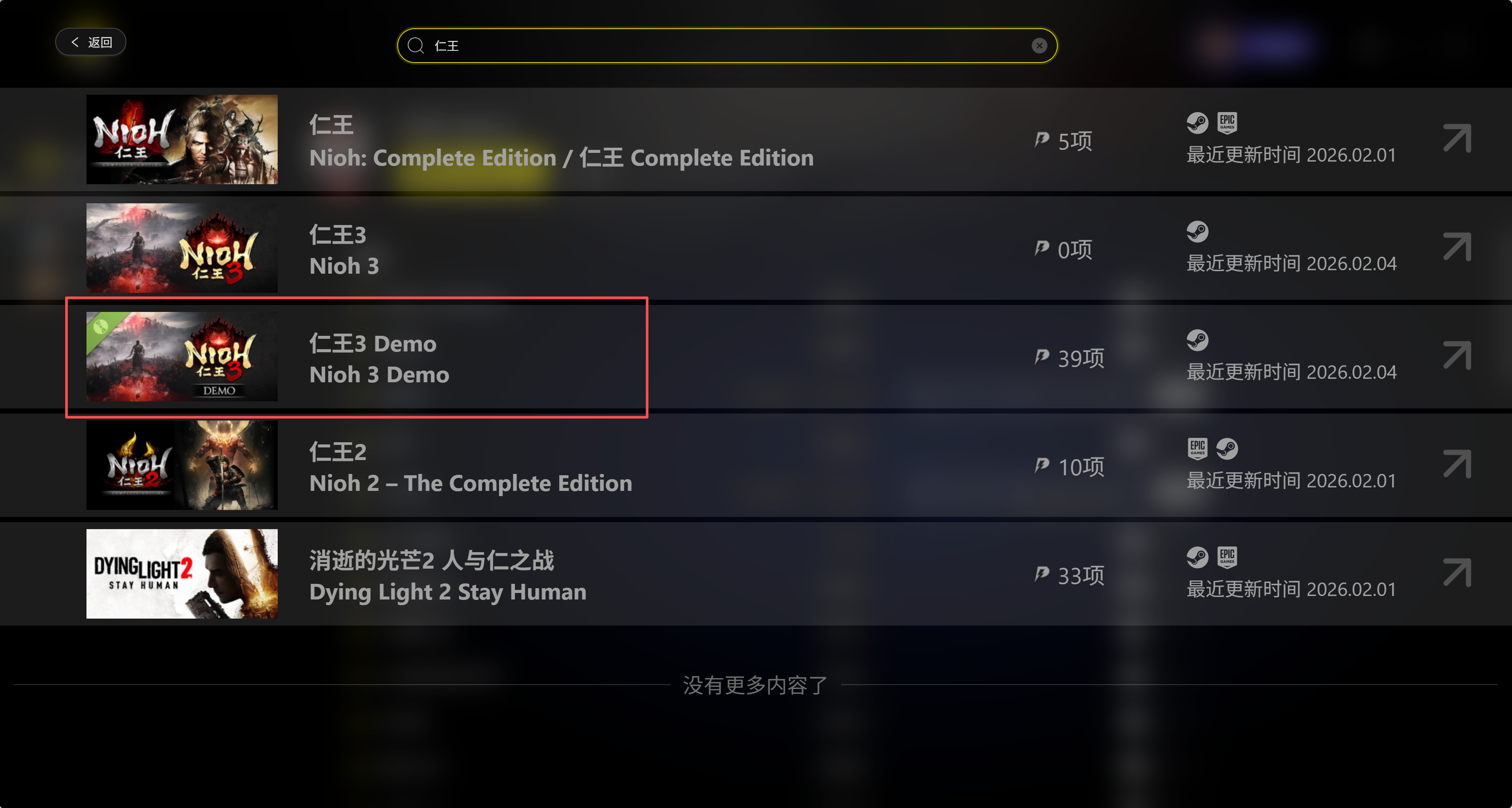 在修改器内找到搜索框,输入游戏关键词 “仁王” 进行搜索。从搜索结果中选择对应游戏进入修改器功能界面。