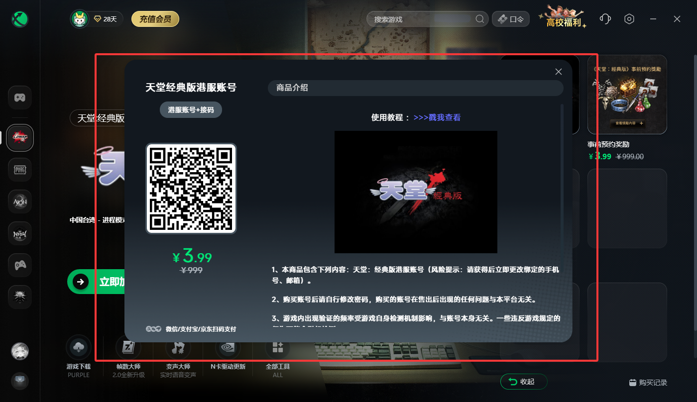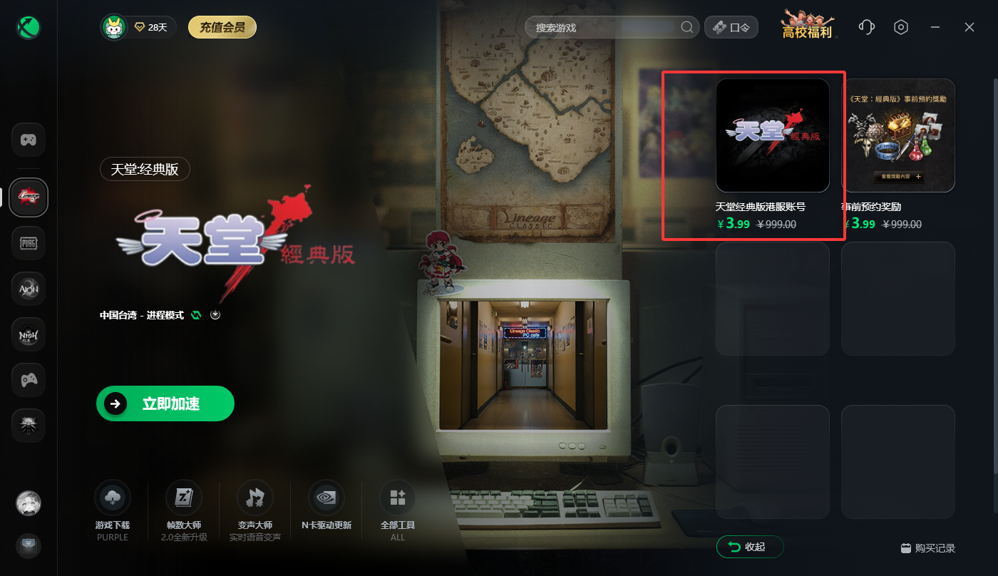 3.点击即可购买天堂经典版港服账号。您亦可选购事前预约奖励等商品。
