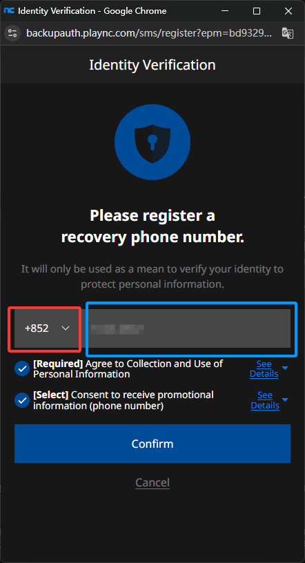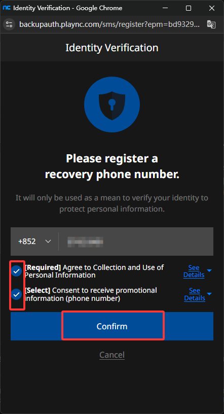 返回手机认证页面填写您的香港/美国手机号后,勾选红框圈出的按钮同意条款后点击确认(confim)即可。