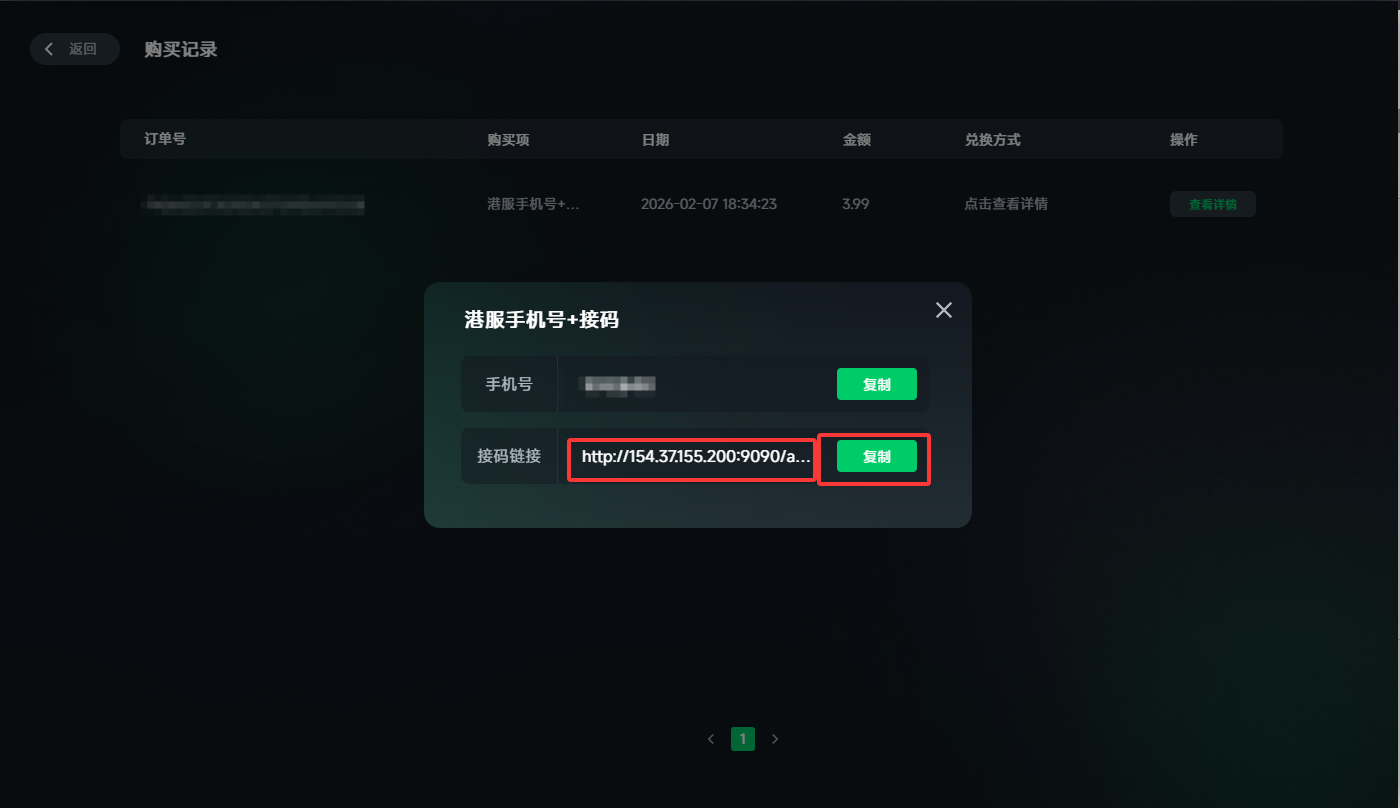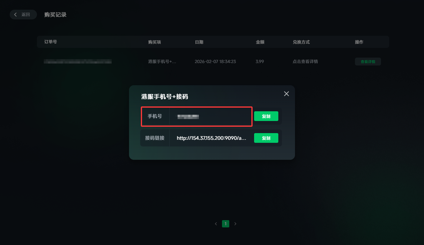 若您是在迅游端内购买的“接码服务”,您只需在对应页面点击"购买记录“即可查看您的香港/美国手机号及对应接码平台链接。点击复制按钮即可复制手机号码。