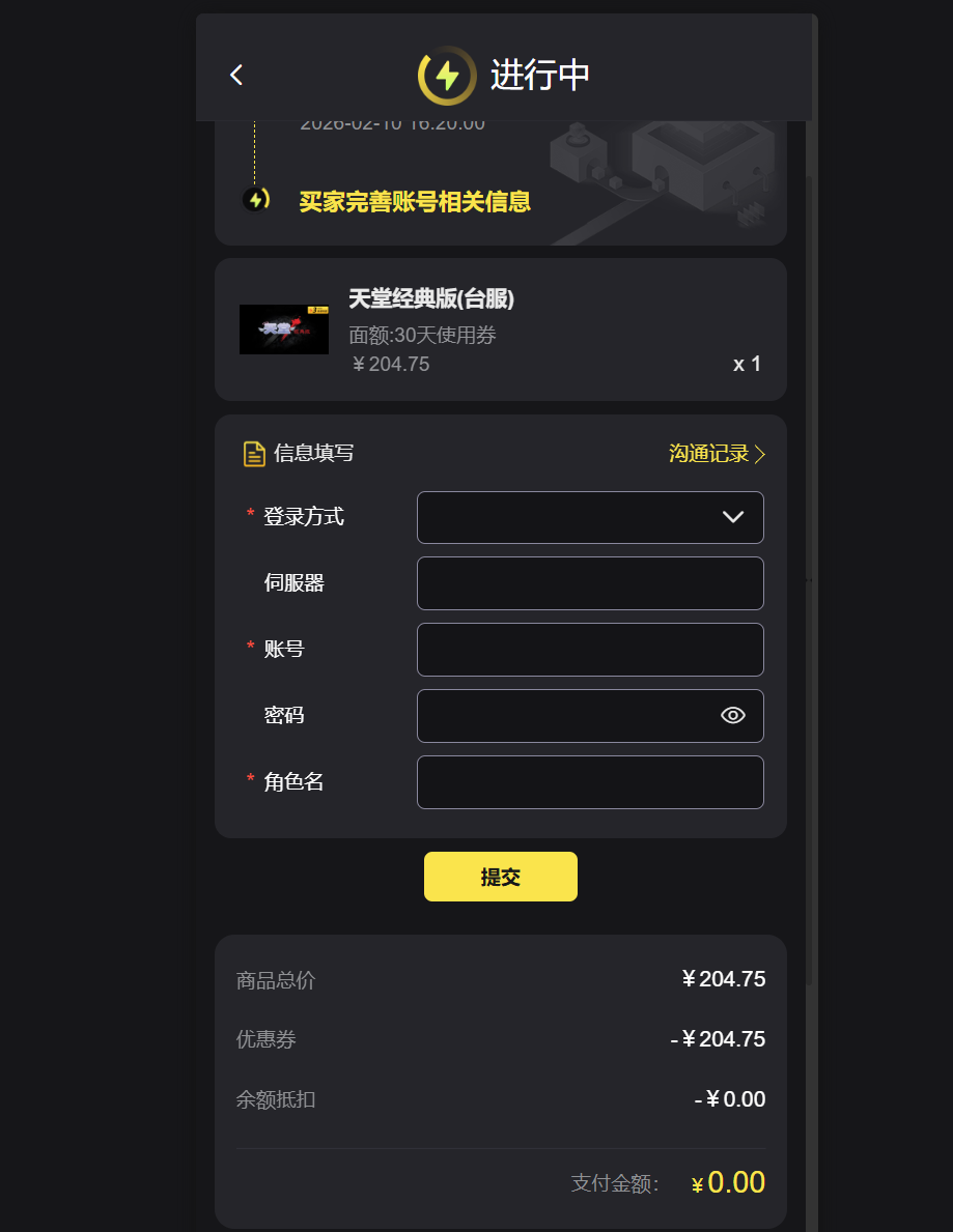 (6)输入登录方式、伺服器、账号密码及角色名等信息。(请放心输入, 该密码仅用于第三方充值)提交后等待发货成功即可。