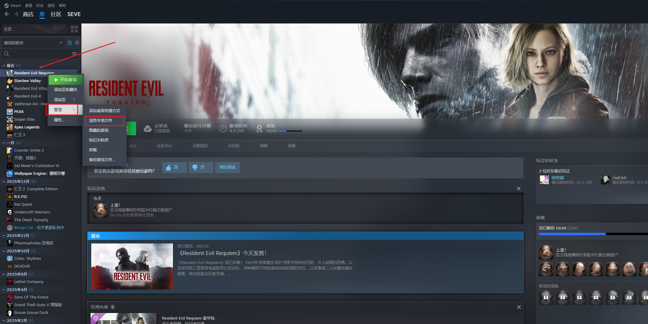 然后打开Steam,在自己库存里找到生化危机9,右键自己库里的生化危机9列表,浏览本地文件