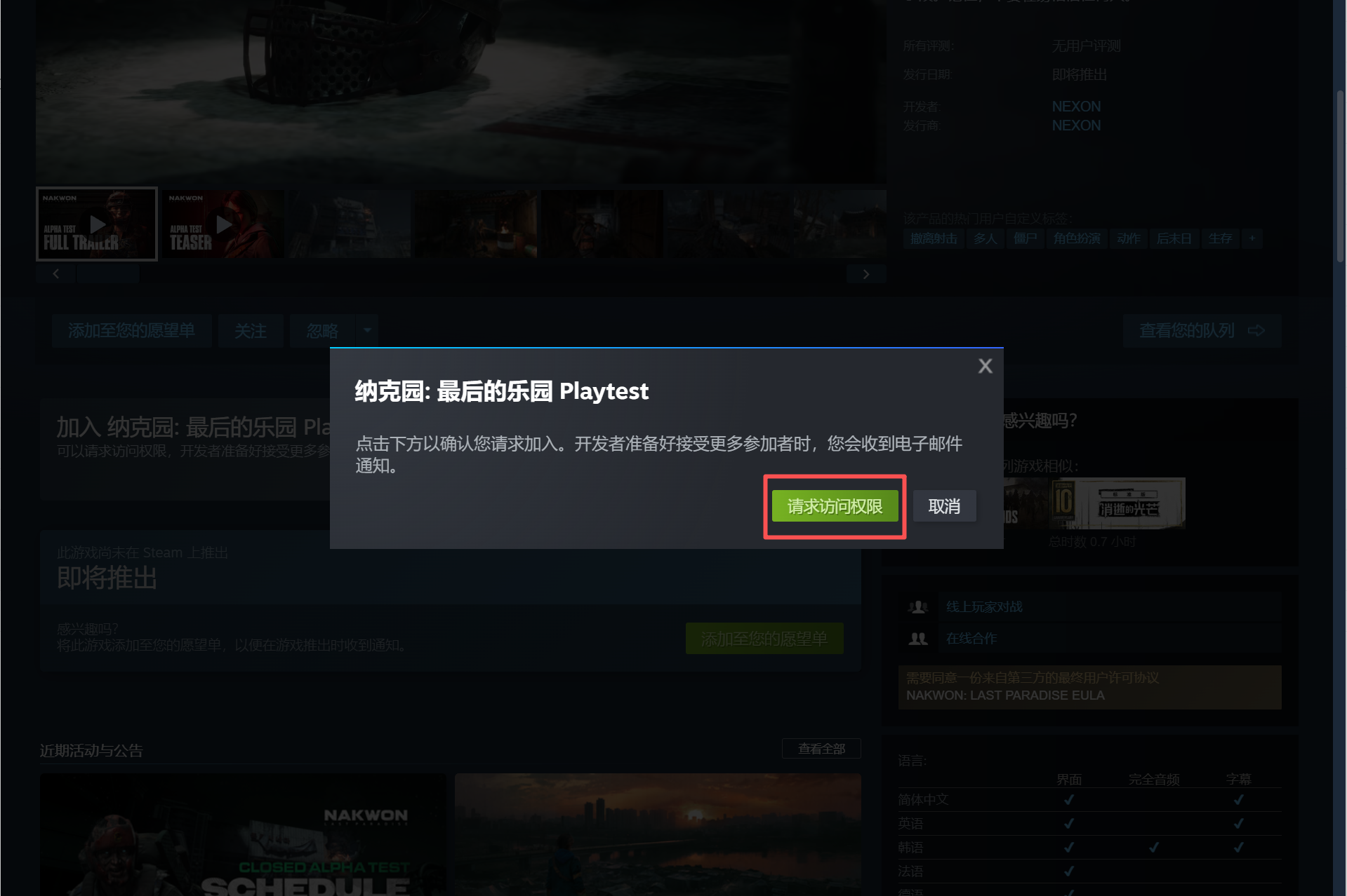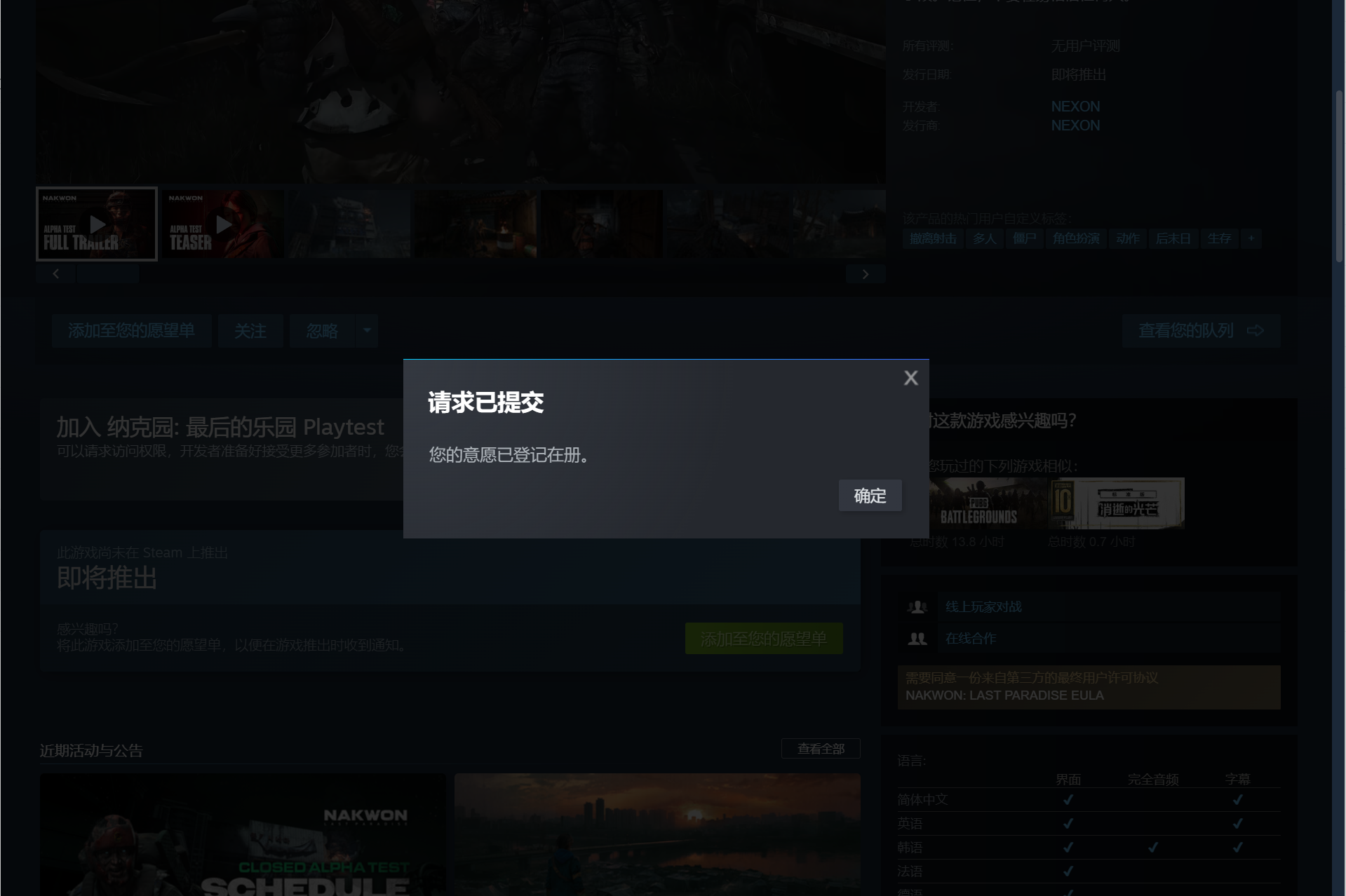 出现此页面即请求提交成功,开发者准备好接受更多参加者时,您会收到来自 Steam 的电子邮件通知,敬请留意。