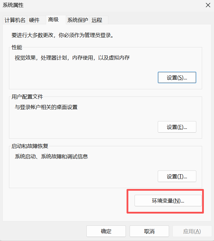 2.进入环境变量设置,在“系统属性”窗口中,点击“环境变量”。