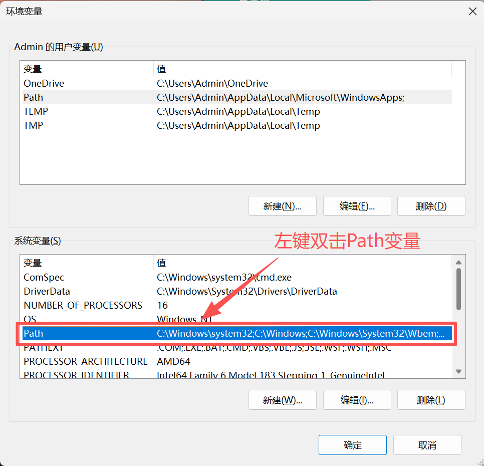 3.检查Path变量,在“系统变量”部分,找到并双击 Path 变量。