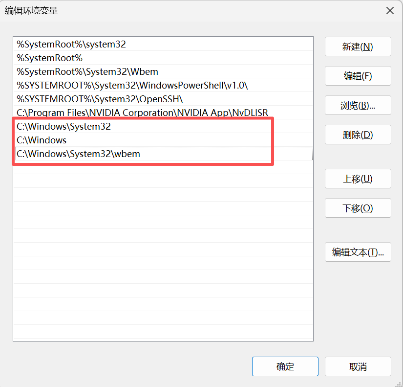 4.确保 C:\Windows\System32 和 C:\Windows 这两个路径存在且未被注释掉。另外,C:\Windows\System32\wbem也要添加在Path中。