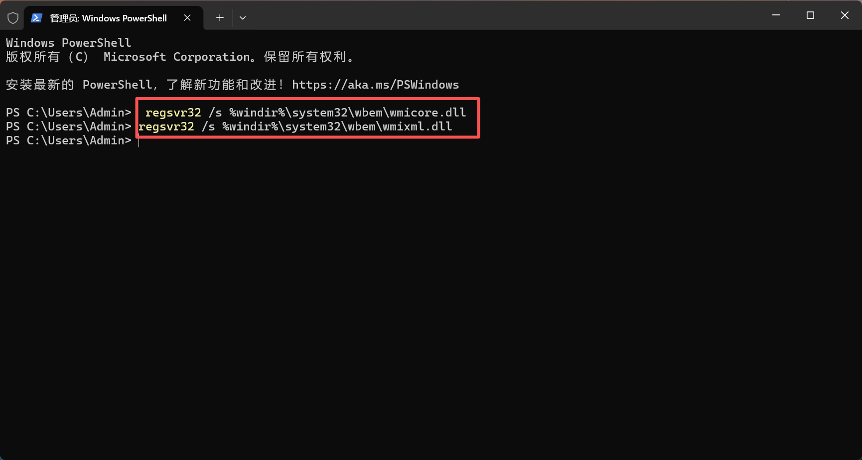 输入 regsvr32 /s %windir%\system32\wbem\wmicore.dll