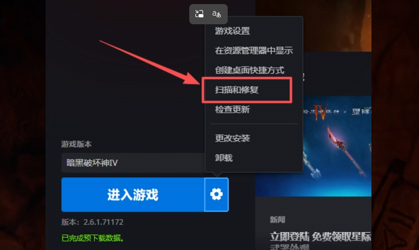 点击暗黑4的设置,扫描和修复验证一下文件的完整性即可