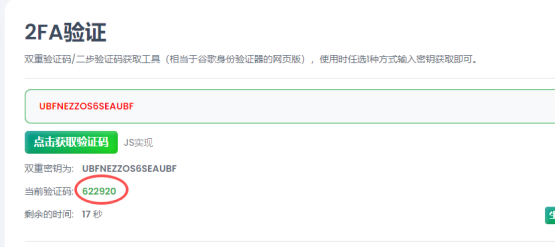 登录过程中会需要填写验证码,可以打开https://2fa.run/,输入秘钥获取验证码,但是要注意验证码的刷新时间