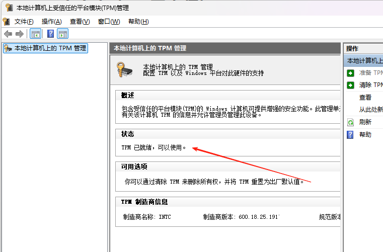 1.键盘直接输入 Win+R,输入【tpm.msc】并回车,如显示TPM已就绪则无需操作2.若未开启,可参考以下办法:华硕主板: https://www.asus.com/hk/support/faq/1046215/ 微星主板: https://www.msi.cn/faq/faq-4202 戴尔主板: https://shorturl.asia/74vwk 联想电脑: https://support.lenovo.com/us/zc/solutions/ht512598 惠普电脑: https://support.hp.com/cn-zh/document/ish_4425409-4342387-16 Surface电脑: http://d6a.cn/DvZKa 若是其他主板,可参考上述教程,搜寻bios中的tpm选项进行开启。