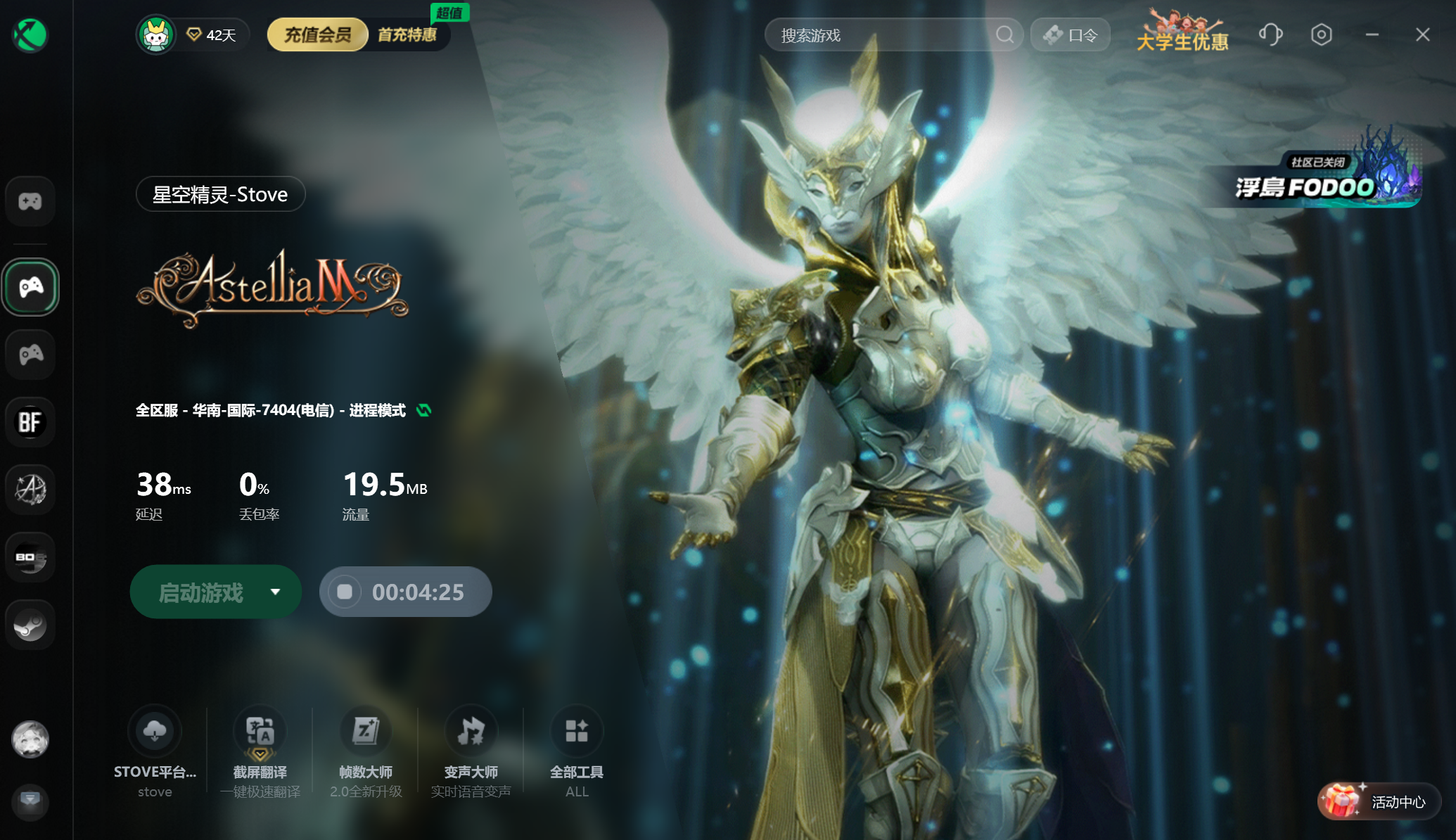 1.打开迅游,加速游戏,点击链接: https://astellia.game.onstove.com/tw 进入游戏官网,登录台服账号,若无账号可点击右上角注册会员3.地区选择Chinese Taipei(中国台北),年龄需要成年,点击下一步4.勾选前两个选项,点击同意后继续5.输入邮箱,点击发送验证邮件6.输入验证码7.输入密码8.点击同意游戏条款9.注册完成,勾选“全部同意”后点击同意10.进入加速器页面,点击“一键入库”11.点击“添加到库”12.成功添加13.打开加速页,点击stove平台一键下载并且安装14.打开stove客户端,登录账号,进入“库”,点击下载按钮15.同意协议,点击“安装”安装成功后即可打开游戏。