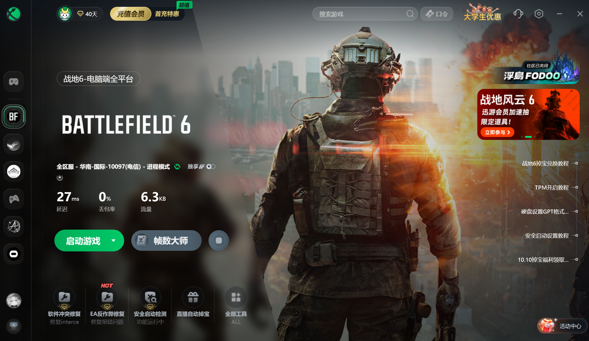 首先 使用迅游加速器加速战地6然后打开游戏,在游玩页中 找到社区选项,再点击搜索体验然后输入想要游玩的刷枪服的体验代码,并点击进入搜索出的服务器然后,点击主持然后下滑设置一个自己的密码,并且关闭持续服务器,然后点击主持即可