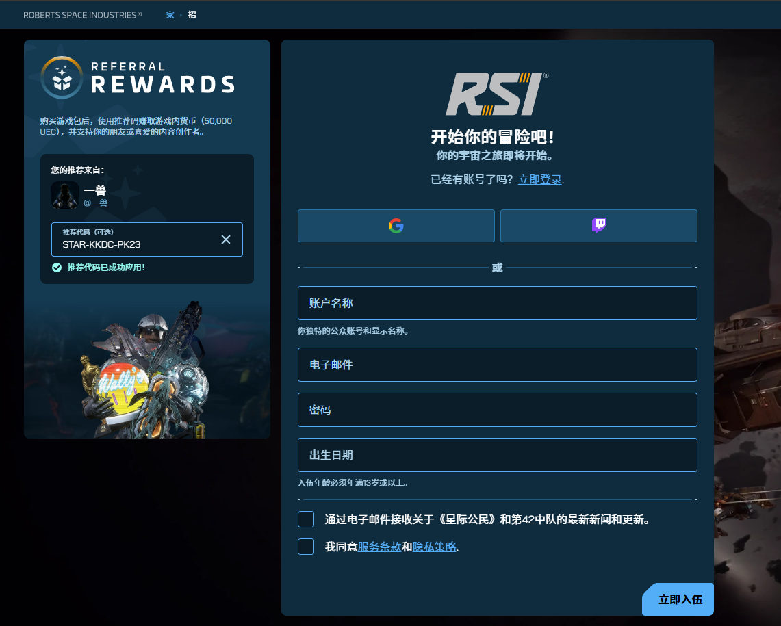 1.加速游戏,点击链接: https://robertsspaceindustries.com/en/enlist 进入注册页面,推荐使用edge或者chrome进行页面翻译2.填入对应信息,勾选同意,点击立即入伍按钮3.输入邮箱中收到的验证码4.账号注册完毕