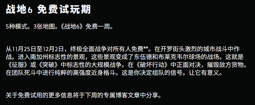 战地6将在11月25日开启部分模式的免费试玩,下面是免费试玩教程:1.搜索战地风云6,进入商店页面2.下滑页面,待免费试玩开启后,直接点击右方的开始游戏即可。