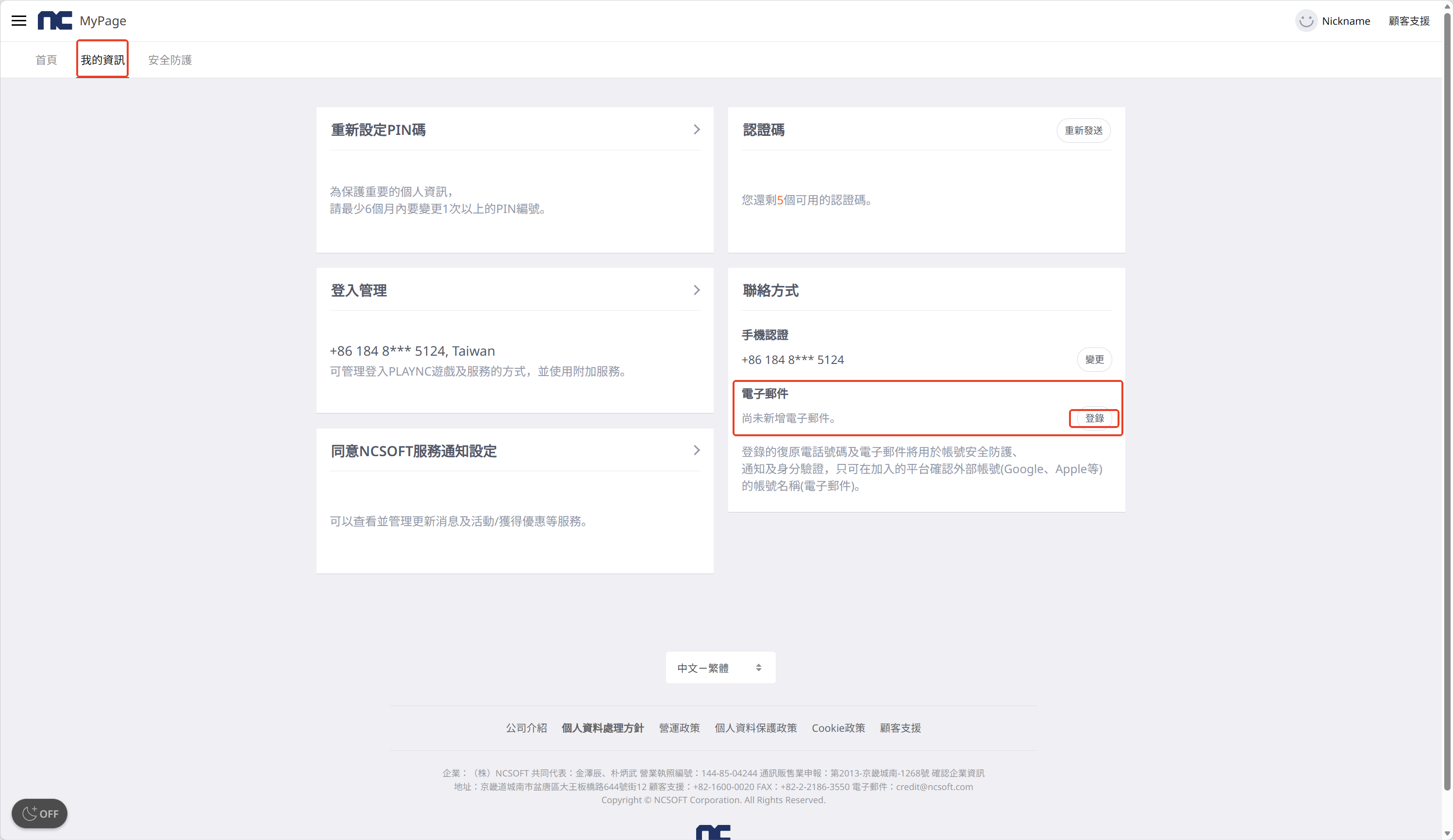 NC新游均需要绑定手机号,进行安全验证之后才能进入游戏。虽然NC官方支持绑定大陆手机号,但是由于游戏方限制,大陆手机号目前有可能无法收到短信。若自己的手机号无法接收验证码,只能通过绑定境外手机号才能进入游戏,下面是教程:1.进入NC官网: https://id.plaync.com/myinfo ,登录后进入我的资讯-手机认证,点击“登录”2.选择对应的地区(香港:+852、美国:+1),输入收到的手机号,点击“确定”3.打开接码网址,输入收到的验证码即可完成绑定。4.以剑灵2为例,在进入游戏时,开启安全验证后会将验证码发送至绑定的手机号,打开相同的接码网址,输入验证码即可登录。下面是换绑成自己手机号的教程:1.进入NC官网: https://id.plaync.com/myinfo ,登录后进入我的资讯-手机认证,点击“变更”2.在弹出的网站中点击“变更”3.打开接码网址,输入收到的验证码4.选择中国,输入自己的手机号,点击发送验证码,输入收到的验证码,点击变更即可完成换绑。