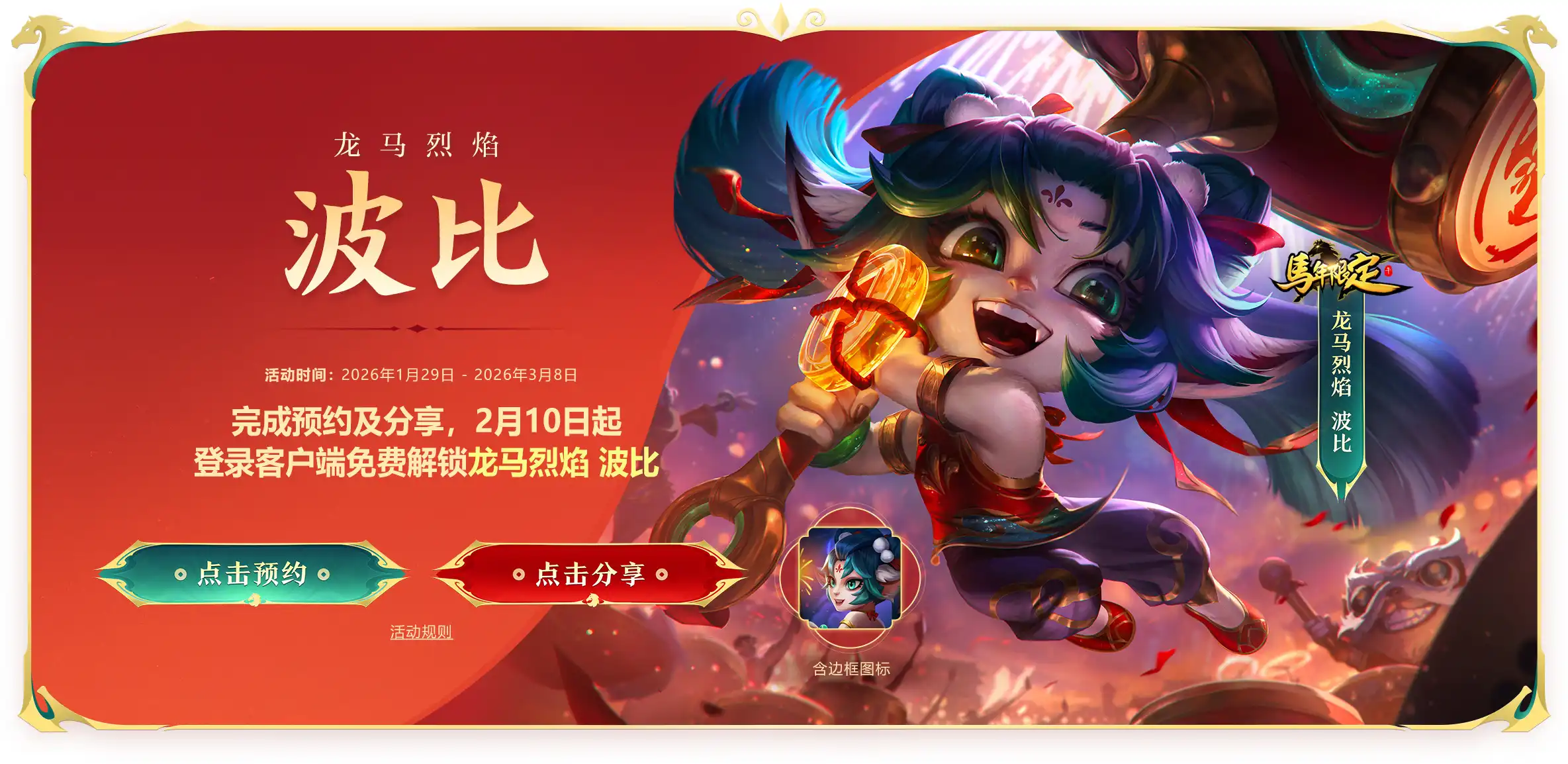 踏雪寻梅至,龙马送福来。岁序更新,敬颂春祺。骏马奔腾,喜迎新春。丙午马年的蹄声渐近,召唤师峡谷也即将覆上新装,静候万象更新。值此辞旧迎新之际,我们谨向所有召唤师致以最诚挚的问候。无论您此刻是在为学业事业孜孜不倦,是已暂别忙碌踏上归途,还是正与好友在峡谷中提前共聚,我们都愿您能暂泊心绪,感受这份来自屏幕后的真挚祝福。愿所有召唤师新的一年:生活中骏业宏开,一马当先!峡谷内旗开得胜,马到功成!节日未至,薄礼先行,英雄联盟在马年春节前夕将为各位召唤师送出4款免费皮肤 和 1款臻彩:1.峡谷新春,烈焰礼至,预约+登录即可领取马年限定皮肤【龙马烈焰 波比】2.比尔吉沃特黑市开启,玩游戏攒银蛇币,可免费得两款皮肤与一款限定臻彩3.海克斯大乱斗版本更新、福利加码,收集强化即可领取一款随机皮肤更多新春活动即将上线:1.新春惊喜礼盒额度翻倍,单个礼盒仅需69元,福气不论单双,好礼必须成对!各位召唤师共可开启4次惊喜礼盒(含【踏雪寻梅】2次 &【龙马烈焰】2次)2.二月礼赠,为各位召唤师准备众多积分奖励,参与英雄联盟活动消费领积分。多买多得,领取珍稀皮肤及臻彩奖励3.春节限时全场半价4.金鸿秘宝即将上线,首次开启6元必得未拥有皮肤,每十次开启额外获赠一款臻彩5.更多新春活动:璀璨臻彩、幸运之门、新春超值自选礼盒等,将陆续开启活动详情:1.免费领取马年限定【龙马烈焰 波比】新年钟声由波比与她的金色大锤敲响——预约并登录即领全新马年限定皮肤 【龙马烈焰 波比】参与规则:● 即日起至2月10日,召唤师们可在【踏雪寻梅至,龙马送福来】活动页面预约领取龙马烈焰波比,预约成功的召唤师将在2月10日收到掌盟提醒,并可在2月10日及之后登录英雄联盟客户端领取 【龙马烈焰 波比】及边框图标;●2月10日后,未提前预约的玩家登录英雄联盟客户端并完成规则要求的三场对局,也可解锁【龙马烈焰 波比】及边框图标。2.比尔吉沃特黑市开启 对局免费得限定臻彩及皮肤比尔吉沃特黑市开启,厄运小姐为召唤师们带来了她的海盗宝藏,活动期间玩游戏赚银蛇币,在黑市中购买各类道具,就能免费解锁两款皮肤及一款臻彩!参与规则:●自2月4日起至4月5日,召唤师完成对局将获取银蛇币,银蛇币可以在“比尔吉沃特黑市”中购买各类道具,并可用于免费解锁两款随机皮肤(也可选择解锁小小英雄);●在“比尔吉沃特黑市”中使用一定数量银蛇币,还将解锁【臻彩 玉剑传说 舞龙卫 珠光】 及 【玉剑传说 舞龙卫】,累计消耗银蛇币奖励:玉剑传说 舞龙卫 珠光3.嗨一把!——新春乱斗再加码海克斯乱斗重磅更新,全新强化、羁绊玩法和免费通行证等你体验。新年期间福利加码,限时开放海克斯图鉴活动,通过海克斯乱斗对局收集强化图鉴,即可获得皮肤及图标等奖励!参与规则:●2月4日至3月8日,在海克斯乱斗模式对局中选择强化即可点亮海克斯强化图鉴(首次选择和重复收集都会累积进度哦),达到一定收集进度即可免费解锁一款随机皮肤。马年限定 踏雪寻梅&龙马烈焰(2026)皮肤即将上线新皮肤:踏雪寻梅(2026)踏雪寻踪惊掠影,凌霜傲立气如虹;寻梅归处留余香,点墨丹青映雪红。2026新春系列皮肤“踏雪寻梅”将于 2月4日 限时上线!莉莉娅、卡特琳娜、亚索、杰斯、卡蜜尔五位英雄身披锦绣春袍,红装素裹共贺马年!邀您共赏这抹凌寒而开的传世梅香。踏雪寻梅(2026)惊喜礼盒不是直购没实力,抽到皮肤更有趣。产出2026马年限定皮肤的【踏雪寻梅惊喜礼盒】,可以购买两次啦!每次仅需69元,即可获得随机指定踏雪寻梅皮肤!【第一重·开门红】: 首次购买,必得奖池内随机【踏雪寻梅】皮肤+指定炫彩,更额外赠送限定 【鹿之祈愿】表情,喜气洋洋迎新岁!【第二重·满堂彩】: 再次购买,再获一款奖池内随机【踏雪寻梅】皮肤+指定炫彩。每位召唤师可购买踏雪寻梅(2026)惊喜礼盒两次,双重优惠喜迎新春,福气不论单双,好礼必须成对!踏雪寻梅惊喜礼盒奖池包含以下四款【踏雪寻梅】皮肤及其指定炫彩:【踏雪寻梅 卡特琳娜】皮肤及其指定炫彩【踏雪寻梅 杰斯】皮肤及其指定炫彩【踏雪寻梅 亚索】皮肤及其指定炫彩【踏雪寻梅 卡蜜尔】皮肤及其指定炫彩踏雪寻梅皮肤及大礼包详细内容敬请留意后续公告新皮肤:龙马烈焰(2026)龙腾四海势不凡,马踏流光报平安;烈焰重燃春意闹,祥云万朵照乾坤。“龙马烈焰(2026)”系列皮肤将于 2月10日 炽热登场!艾希、萨勒芬妮、悠米、吉格斯、凯特琳及波比六位英雄身着瑞兽华服,脚踏赤焰贺新年,共同开启龙马精神的崭新一年。龙马烈焰(2026)惊喜礼盒各位召唤师也一定不要错过【龙马烈焰惊喜礼盒】的特别优惠,仅需69元,首次购买获得奖池内随机【龙马烈焰】皮肤+指定炫彩+本喵求求你了表情,第二次购买获得奖池内随机【龙马烈焰】皮肤+指定炫彩。每位召唤师可购买龙马烈焰(2026)惊喜礼盒两次,双重优惠喜迎新春!龙马烈焰惊喜礼盒奖池包含以下五款【龙马烈焰】皮肤及其指定炫彩:【龙马烈焰 艾希】皮肤及其指定炫彩【烈焰美人 凯特琳】皮肤及其指定炫彩【龙马烈焰 吉格斯】皮肤及其指定炫彩【龙马烈焰 萨勒芬妮】皮肤及其指定炫彩【龙马烈焰 悠米】皮肤及其指定炫彩龙马烈焰皮肤及大礼包详细内容敬请留意后续公告二月礼赠二月也将为各位召唤师继续带来礼赠活动,参与活动领取积