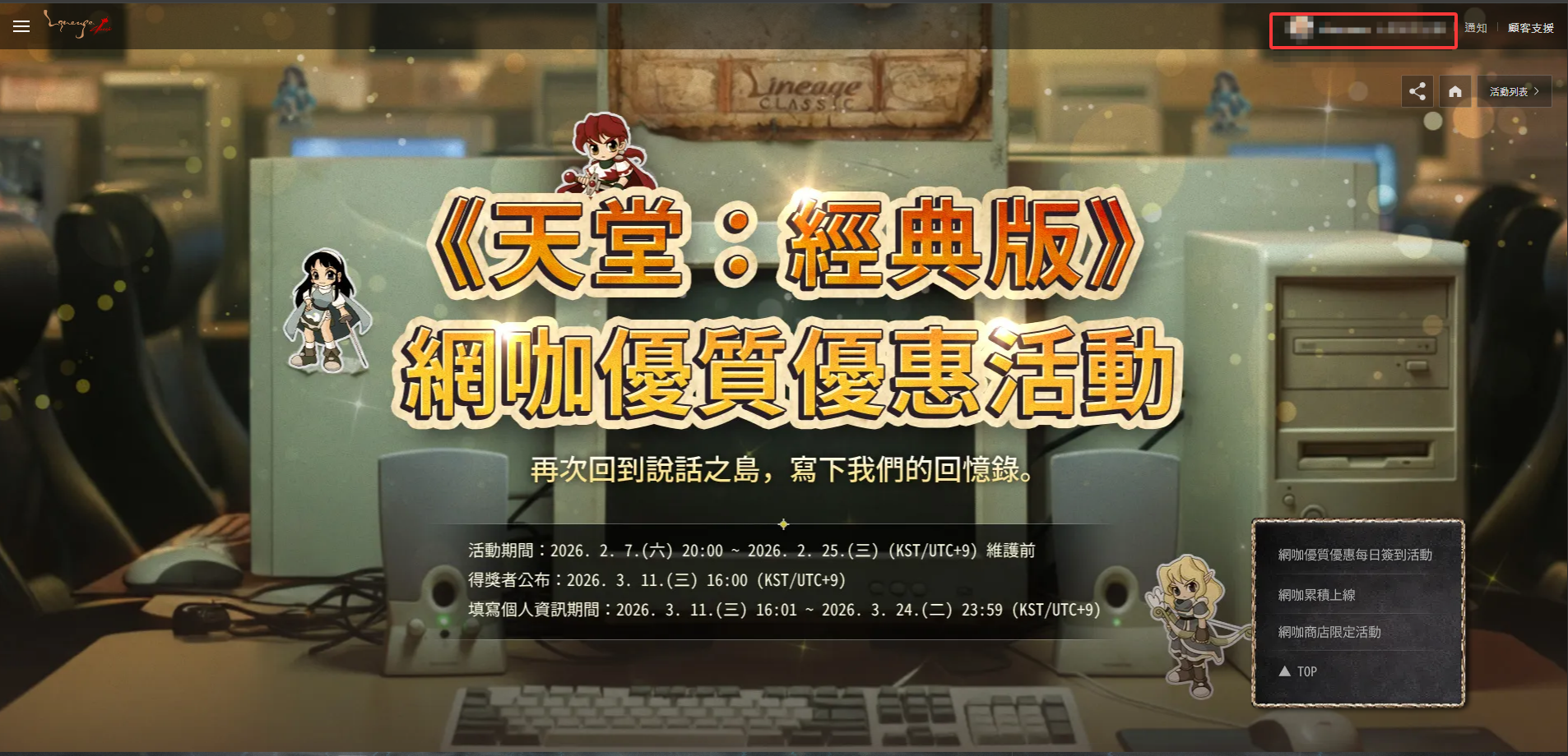 点击此处访问《天堂:经典版》网吧优惠活动。进入活动首页,点击右上角此处即可进行登录。点击此处访问《天堂:经典版》经典商城,点击“网咖优质优惠”即可购买“毕克斯的沙漏箱”道具。购买成功后道具将会发放至您的角色。返回活动页,可知参与该活动需要在《天堂:经典版》游戏内使用购买的“毕克斯沙漏”道具并于当天持续游玩一小时以上;且前一日7:00-当日6:59的累计使用时间反映在当日11:00当系统判定您的角色满足条件后,下方每日签到使用奖励页面的领取按钮就会亮起。请注意:若您想要领取下一天的签到奖励,您需要重新购买“毕克斯沙漏”并在游戏中游玩一小时以上。点击领取后网页将会为您发放奖励兑换码,点击此处查看兑换教程。除去签到奖励外,系统还会根据网咖累计线上时长发放抽奖点数,每累计使用一小时可以积累一点抽奖点数。累计一定点数后,您可在该页面花费点数进行抽奖获取礼品。除此之外,所有在游戏内使用“毕克斯的沙漏”参与本活动的玩家都可以在游戏内NPC"说话之岛皮塞尔“或”说话之岛吉尔“处花费“毕克斯的羽毛”购买道具。