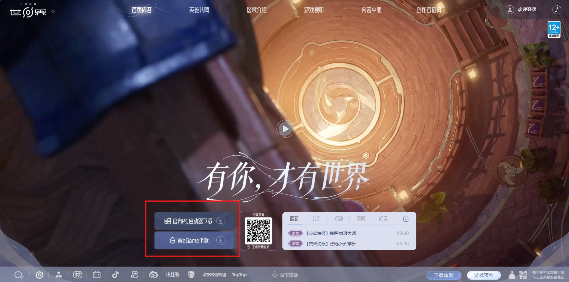 王者荣耀世界定档4月10日公测,支持Windows系统,可前往官网下载:>>>点击前往进入官网后,可选择官方PC启动器下载或WeGame下载两种方式