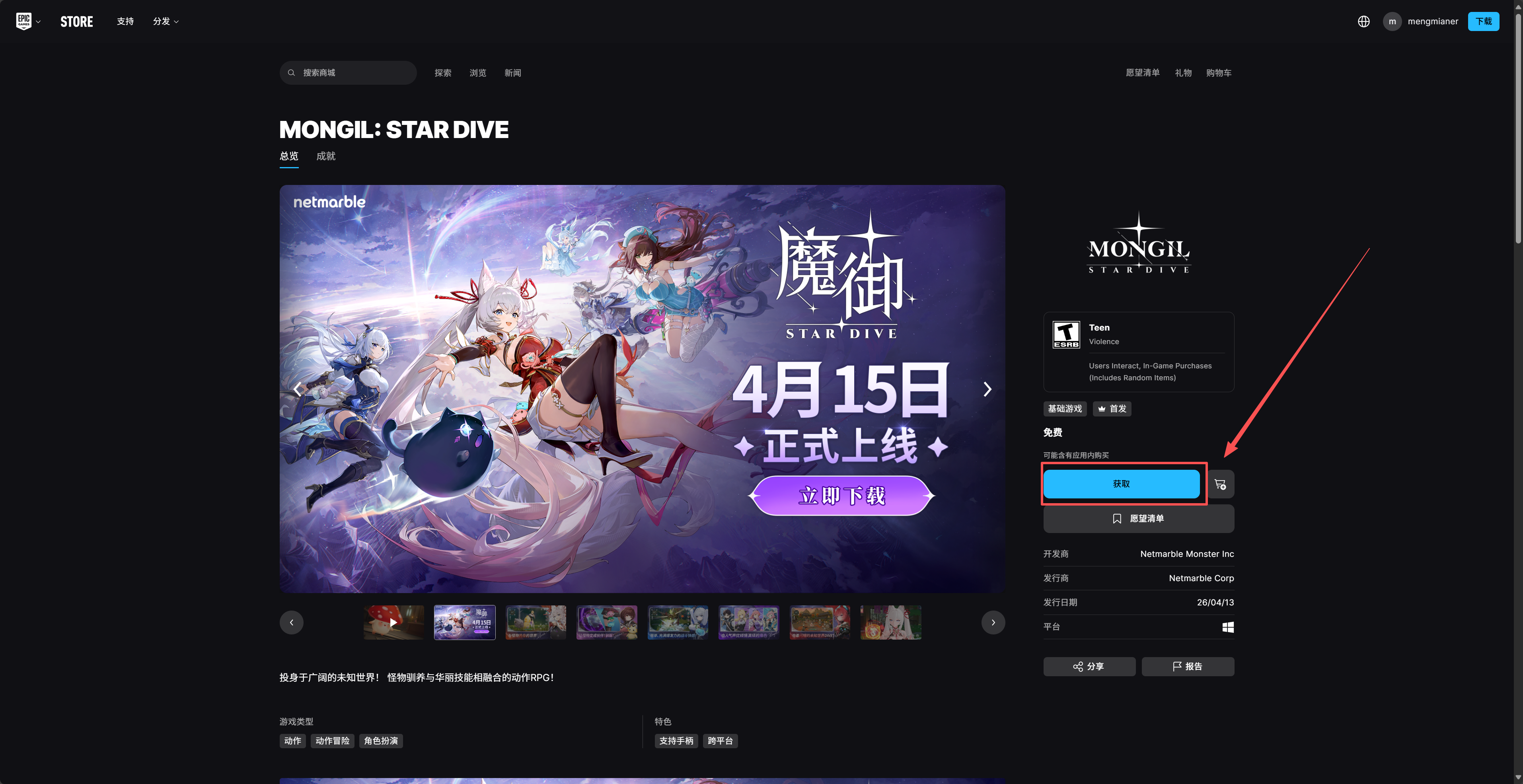 1.加速EPIC商城,参照EPIC换区教程进行换区 点击前往 2.在EPIC商店页搜索“魔御star dive",点击“获取”,待游戏发售即可下载游玩