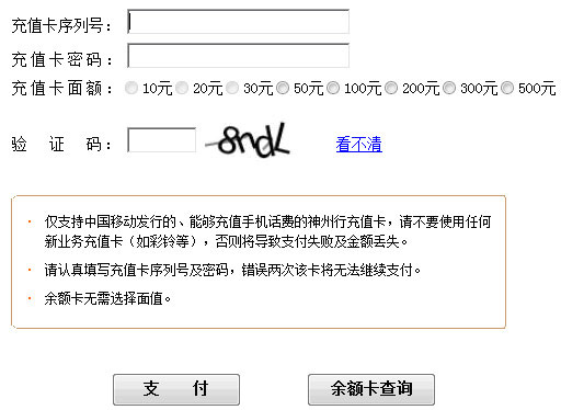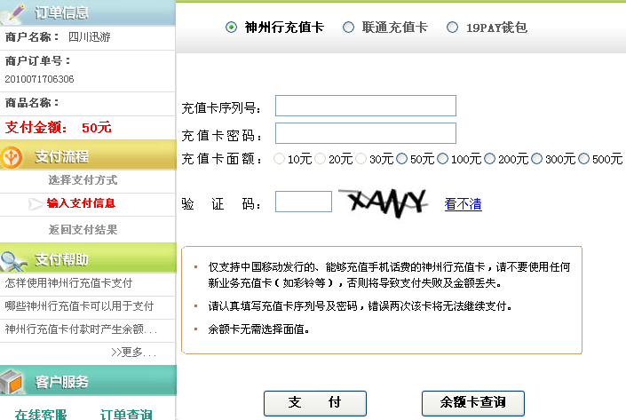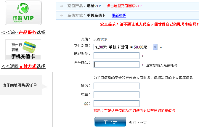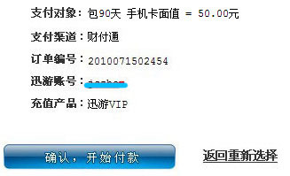 根据页面的提示,输入购买的手机充值卡(移动或联通)序列号(或卡号)及密码,选择本次订单的金额后,点击“支付”。支付成功即可开通迅游服务。