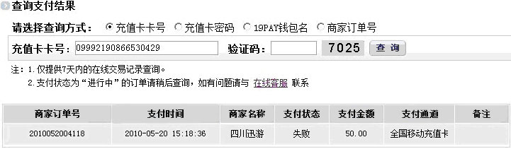 输入手机充值卡序列号(或卡号)或密码后,可以查询使用信息,如下图:
