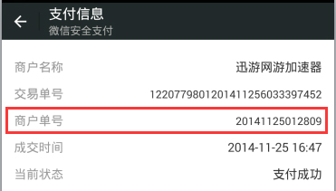 商户订单号即为迅游订单,当您的充值出现异常时,请将此订单号的截图(如下图)提供给迅游客服处理
